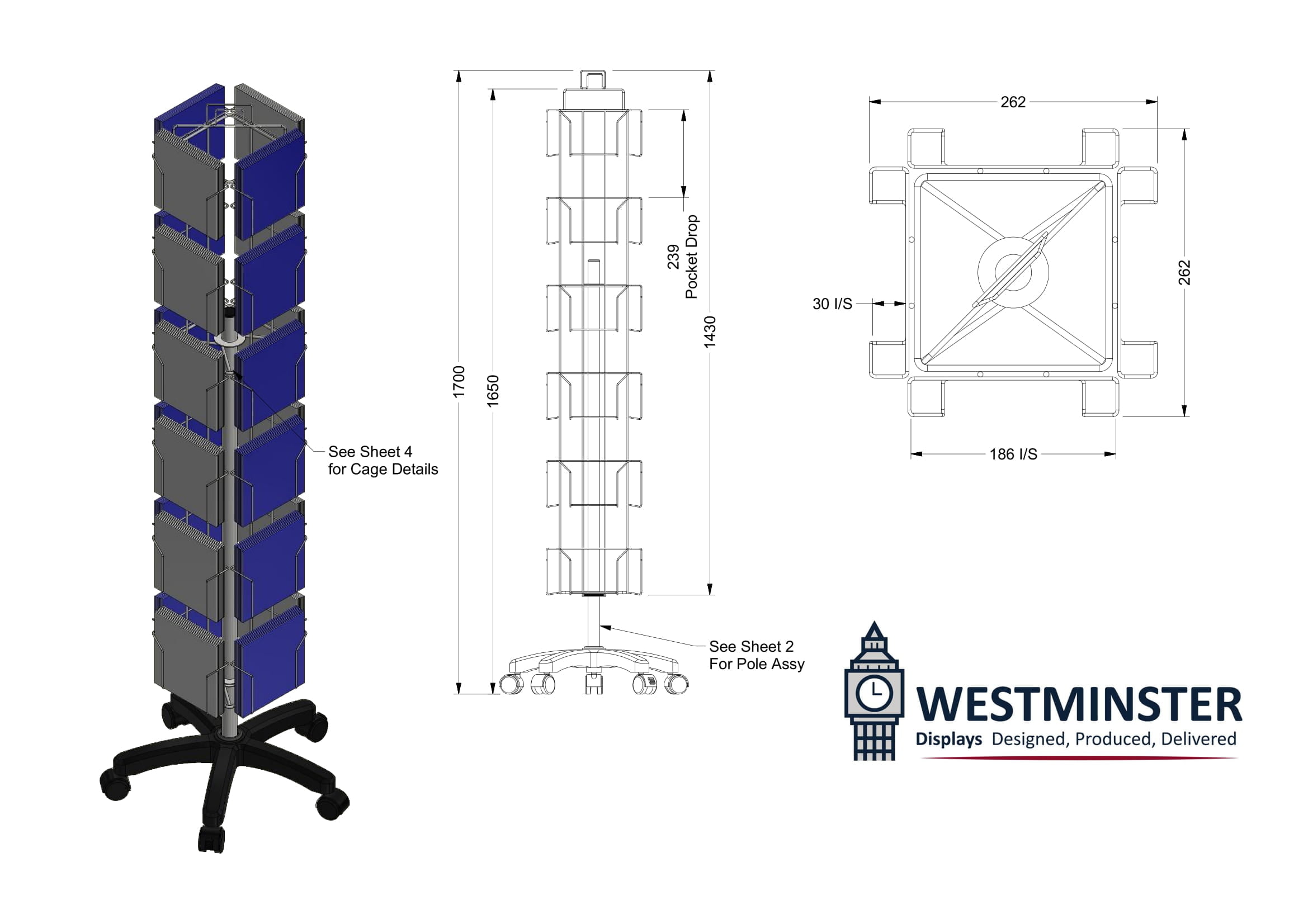 .This rotating floor stand has 24 pockets over 4 sides to suit 7″x7″ (177.8mm x 177.8mm) cards in a portrait orientation. A small footprint and maximum product exposure makes this stand an attention grabbing answer to your card display requirements. Manufactured in the UK and available in a durable plastic coated finish.